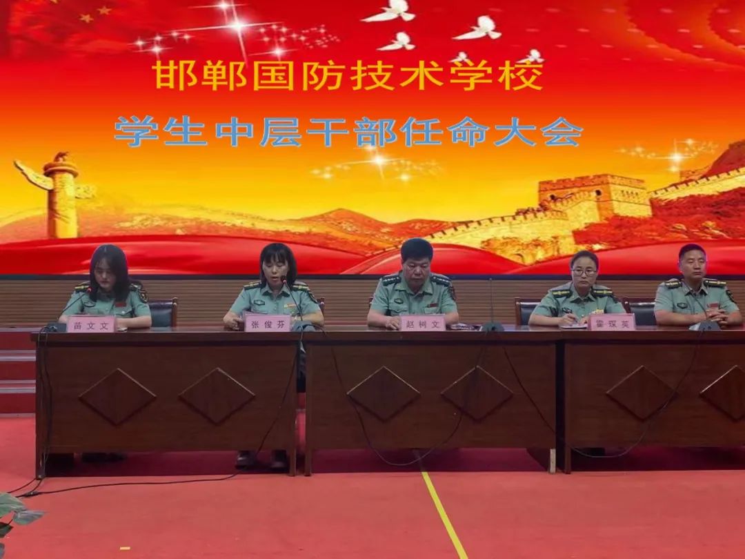 为进一步加强学生干部队伍建设,增强学生干部的使命感和凝聚力,充分发挥学生干部表率作用,邯郸国防学校特开展了学生中层干部任命大会,由教务处苗文文主任主持会议流程。由张校长宣讲代理排长和代理副排长学生任命通知。